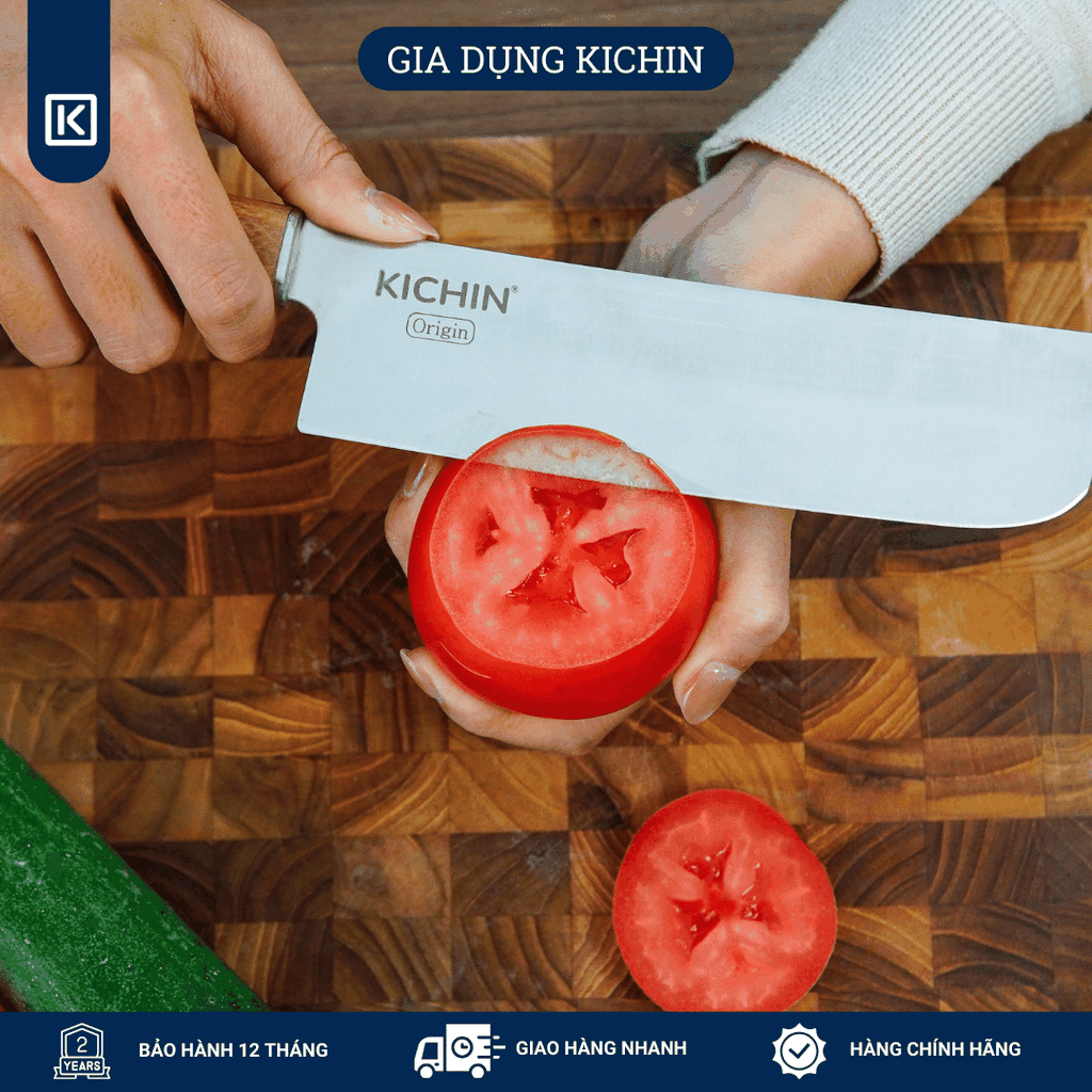 Thiết kế đầu vuông (Nakiri) chuẩn phong cách Nhật Bản, giúp cắt thái rau củ, thịt, hoa quả nhanh chóng và đều đẹp.