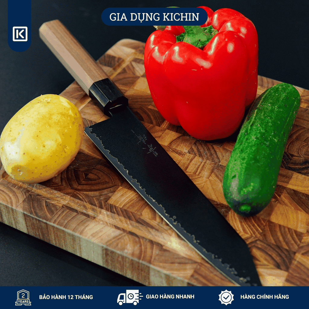 Thiết kế Kiritsuke Wa cao cấp: Kiểu dáng Kiritsuke truyền thống kết hợp cán Wa Nhật Bản, mang vẻ đẹp sắc sảo, mạnh mẽ và rất được ưa chuộng trong giới đầu bếp chuyên nghiệp.
