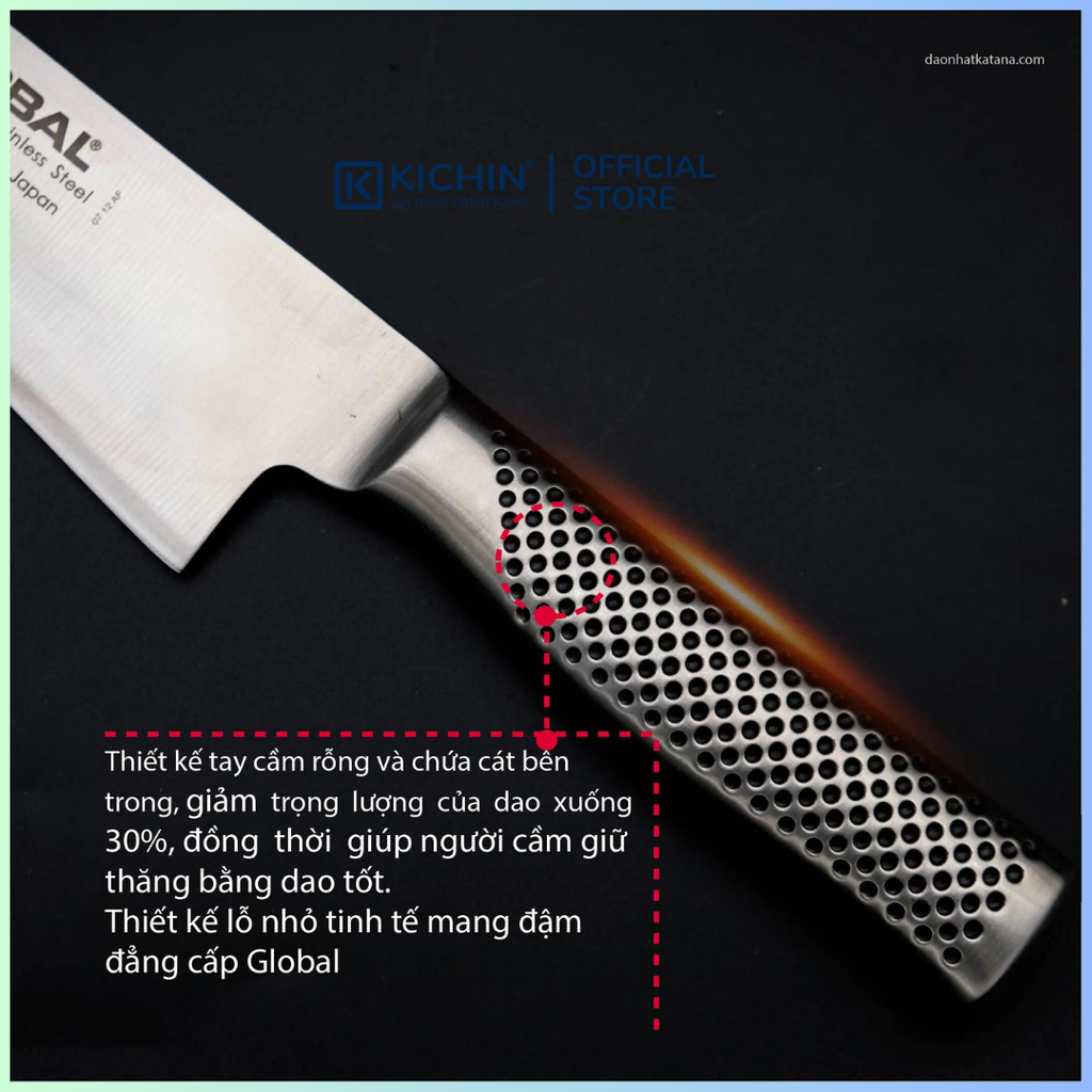 - Thiết kế tay cầm rỗng và chứa cát bên trong cùng các vết lõm trên cán dao tạo độ bám, chống trơn trượt khi sử dụng