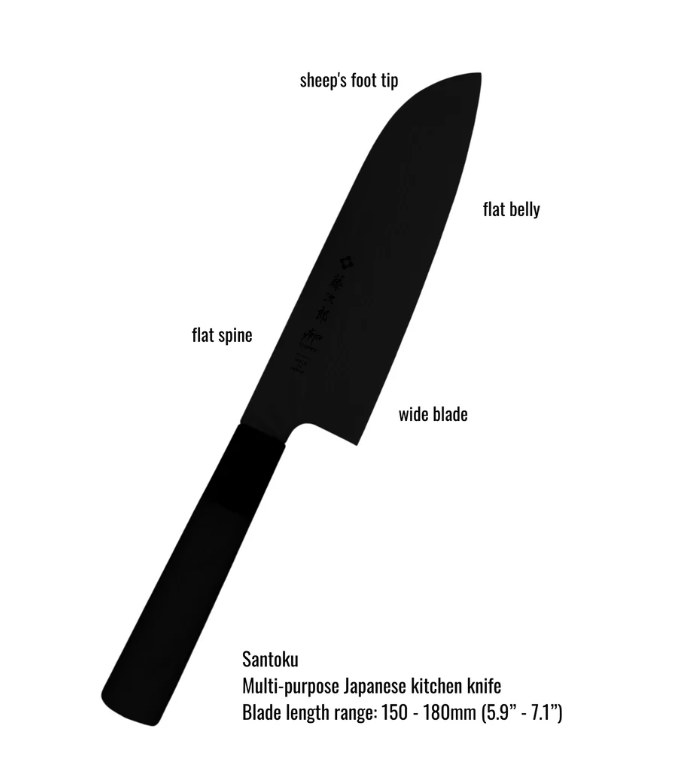 So với dao Chef phương Tây, Santoku có bụng dao phẳng hơn và lưỡi dao rộng hơn. Trong thực tế, điều này mang lại lợi thế khi chế biến rau củ, thường sử dụng kỹ thuật cắt đẩy về phía trước và xuống trên thớt. Lưỡi dao rộng với đường cong nhẹ nhàng về phía đầu tạo nên hình dáng "chân cừu" đặc trưng - đầu dao tròn, ít nhọn, hoàn hảo cho những công việc tỉ mỉ và đòi hỏi độ chính xác cao.